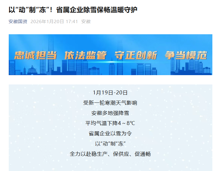 1月20日安徽國資微信公眾號:以“動”制“凍”!省屬企業(yè)除雪保暢溫暖守護(hù)